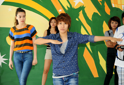 để cô thị phạm cho các thí sinh từng cái gập lưng, cái lắc đầu, bước di chuyển