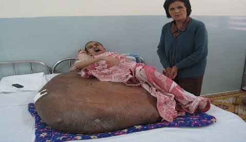Anh Nguyễn Duy Hải (SN 1980, thường trú tại TP. Đà Lạt, tỉnh Lâm Đồng) mắc khối u bướu sợi thần kinh với kích thước khổng lồ ở chân. Từ năm lên 4 tuổi, anh Hải bỗng bị nổi bướu ở chân phải, khối u ngày càng phát triển nhanh. Đến năm 17 tuổi, khối u bên chân phải của anh Hải đã nặng tới 28kg khiến anh đau đớn và không thể tự mình đi lại được. Khi đó, để hạn chế sự phát triển của khối u, Bệnh viện Đa khoa Lâm Đồng đã cắt bỏ cái chân phải quá khổ cho bệnh nhân Hải. Tuy nhiên, năm anh Hải 21 tuổi, đoạn chân phải còn lại của anh tiếp tục to ra. Theo thời gian, khối u phát triển bao kín cả phần mông và lưng của anh. Đến nay, khối u mà anh Hải phải mang trên người đã dài gần 1,2m.