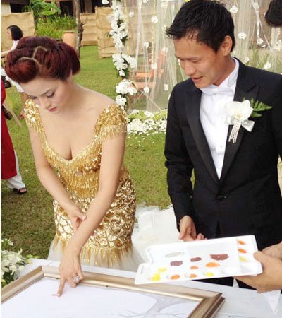 | Không khí trong tiệc cưới trang trọng mà rất ấm cúng, cô dâu chú rể in dấu vân tay vào bảng chúc mừng của khách (Ảnh: ione) |