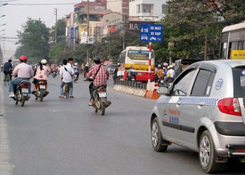 | Tình trạng xe máy, xe đạp lấn làn ô tô diễn ra rất phổ biến tại các tuyến phố đang được phân làn của Hà Nội (Ảnh chụp trên đường Giải Phóng) |