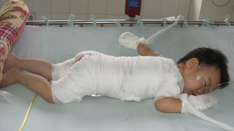 Trong khi cả nhà mải làm cỗ, thì bé Huệ (2 tuổi, trú tại Yên Khánh, Ninh Bình) đang chơi ở gần đó đã không may ngã vào nồi nước canh 20 lít, khiến bé bị bỏng toàn bộ phần mông, lưng và bộ phận sinh dục.