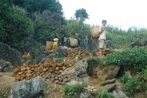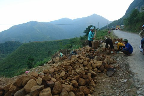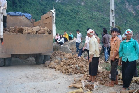 | Người dân tập kết quặng tại chân dốc xã Vũ Nông, huyện Nguyên Bình, Cao Bằng. |