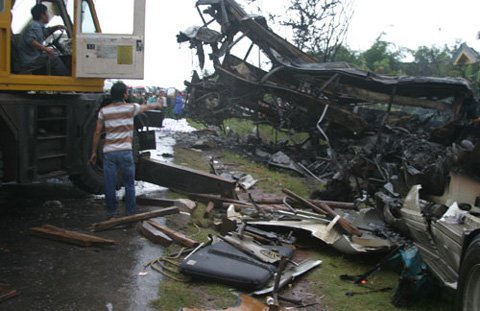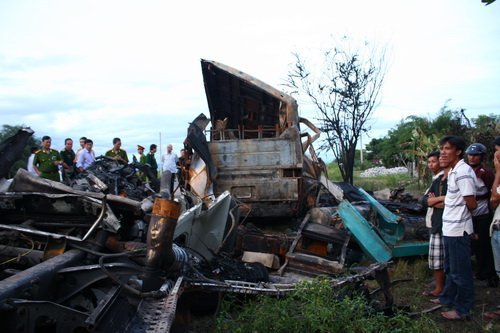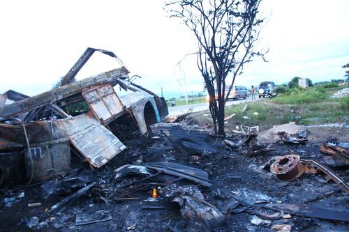 Hai chiếc xe, một chiếc đầu kéo và một chiếc xe khách loại 50 chỗ đang hừng hực lửa. Nhiều tiếng kêu thảm thiết vọng ra từ trong đống lửa. Chiếc xe khách bị lật úp đã nhốt hàng chục hành khách không thể thoát ra. Lửa vẫn đỏ rực”.