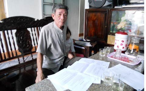 | Ông Lương Thanh Lộc bên đống hồ sơ, giấy tờ khiếu nại, đòi quyền lợi chính đáng khi bị UBND Thị trấn thu hồi đất. |