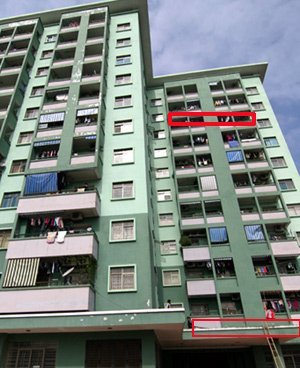 | Tòa nhà chung cư No21 nằm trong khu đô thị Pháp Vân – Tứ Hiệp – nơi xảy ra vụ tai nạn. Phòng 914 nằm ở block bên phải (tầng 9 được đánh dấu màu đỏ). Ô màu đỏ phía dưới là nơi cháu Đức bị rơi xuống |