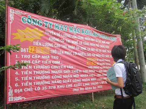 băng-rôn, biển thông báo tuyển dụng lao động phổ thông với số lượng lớn. Đó là