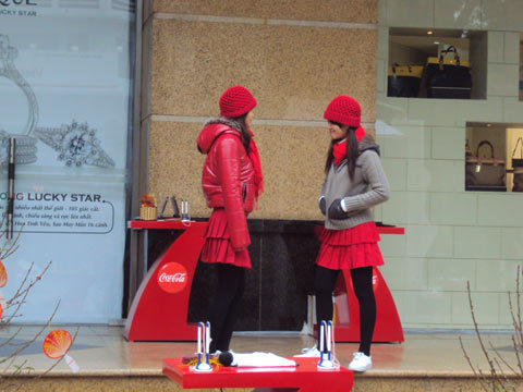 Phải đứng để tổ chức sự kiện nhân dịp Tết trước một siêu thị lớn trên đường Bà Triệu, một PG chia sẻ: “Ngày làm việc của bọn em được chia làm 2 ca sáng từ 9 – 11h, chiều từ 3 – 21h. Nhưng làm việc vào những ngày này thì sáng hay tối cũng chỉ có lạnh và lạnh thôi. Lâu không thấy khách vào mấy chị em lại tranh thủ đứng ôm nhau cho ấm, không thì nhúm nhẩy theo tiếng nhạc cho chân đỡ tê”.