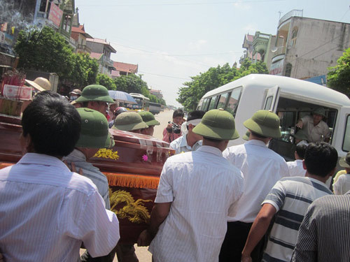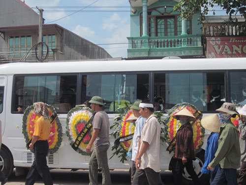 2 chiếc quan tài vợ chồng anh Ngọc được đưa ra, len khỏi đám đông, đưa lên xe. Chiếc quan tài nhỏ mang thi hài cháu Trịnh Thị Thảo mới 18 tháng tuổi được chuyển ra sau cùng, được kết đầy hoa trắng.