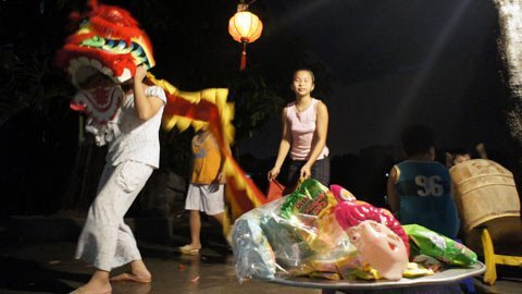 vài em nhỏ múa lân bên mâm cỗ ngày rằm vắng “bóng” chị Hằng.
