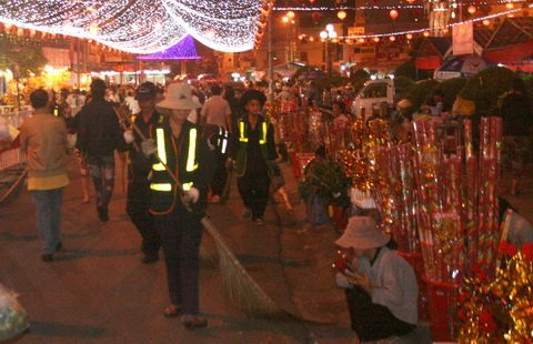 5g sáng. Khách đổ về càng lúc càng đông. Trong dòng người viếng chùa, một nhóm công nhân vệ sinh vẫn căm cụi quét rác; con đường phía trước chùa sạch bong…