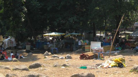 | Dưới chân núi hàng quán mọc lên nhếch nhác. |
