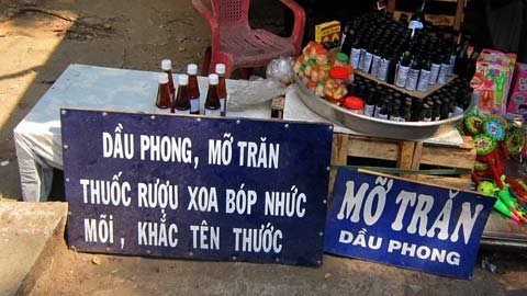 | Các loại sản phẩm được quảng cáo là từ trăn rừng chính chính hiệu bày bán dọc đường lên núi. |