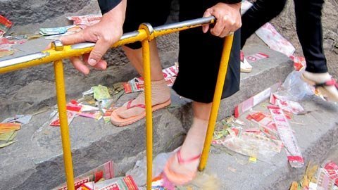| Tay nắm ở bậc thang lên xuống vừa sơn trước Tết Nguyên đán giờ đã bị mài nhẵn nhụi và rác ngập các bậc thang. |