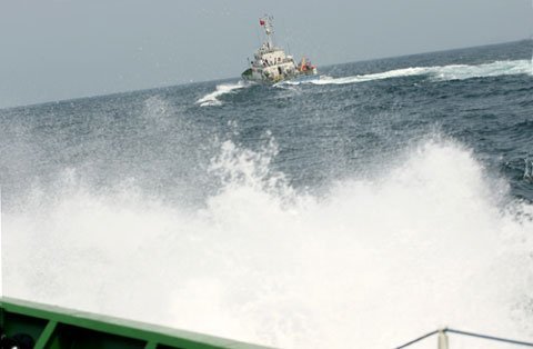 | Thượng úy Đoàn Đức Dương - lái tàu 2008, Hải đội 1 có 18 năm trong nghề với hàng chục ngàn hải lý an toàn cùng thượng úy Lê Văn Quế - Thuyền trưởng tàu 2008 (người chỉ tay) trên đường tuần tra, kiểm soát địa phận Vịnh Bắc Bộ |