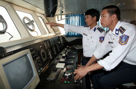 Thượng úy Đoàn Đức Dương - lái tàu 2008, Hải đội 1 có 18 năm trong nghề với hàng chục ngàn hải lý an toàn cùng thượng úy Lê Văn Quế - Thuyền trưởng tàu 2008 (người chỉ tay) trên đường tuần tra, kiểm soát địa phận Vịnh Bắc Bộ