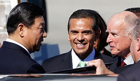 Thị trưởng Los Angeles Antonio Villaraigosa và Thống đốc California Jerry Brown chào đón phó Chủ tịch Trung Quốc Tập Cận Bình tại sân bay quốc tế Los Angeles. Ảnh: AP |