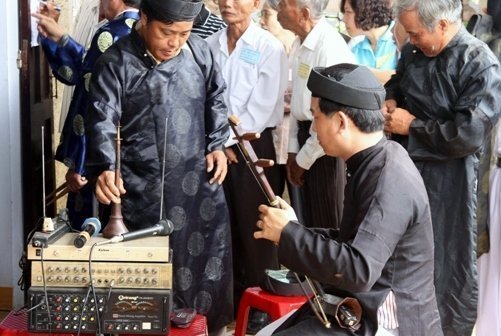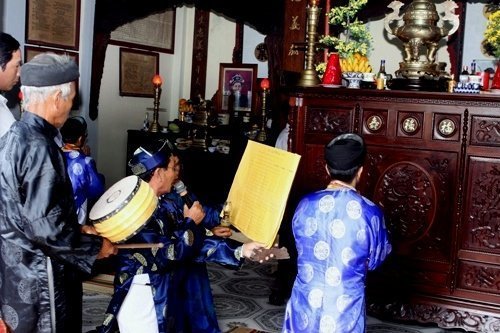 Nhạc công "nhị điện" đang so dây chuẩn bị cho lễ tế trong nhà thờ tộc Hoàng (Huỳnh). |