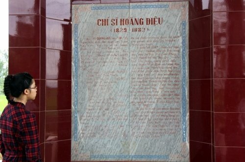Trong khi đó nhóm hỗn hợp từ Hà Nội và TP Hồ Chí Minh tranh thủ ra thắp hương tại mộ cụ Hoàng Diệu, nằm ngoài cánh đồng thôn Xuân Đài. Trong ảnh là cô cháu nội của GS Hoàng Tuỵ đọc tấm bia ghi công đức của cụ Hoàng Diệu. Photo: Hoàng Dũng |