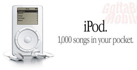 Máy nghe nhạc iPod: “1,000 songs in your pocket – 1.000 bài hát trong túi bạn”. Đó là thông điệp khác biệt về dung lượng bộ nhớ của iPod so với những máy nghe nhạc MP3 khác (lúc đó chỉ chứa được 30 bài hát).