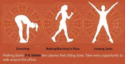 Ba hoạt động được cho là tốt nhất cho những ai hay ngồi chính là gập thân, đi bộ và nhảy tại chỗ. Việc đi bộ giúp bạn đốt cháy được lượng calori gấp ba lần lúc ngồi. Từ đó giảm thiểu chứng béo phì và tim mạch.