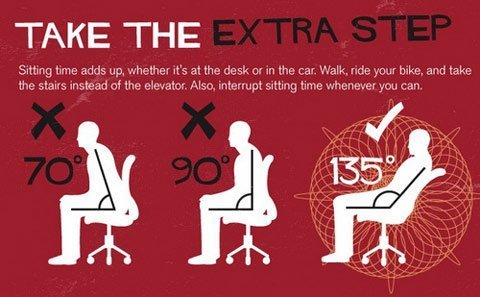 Ngoài ra, tư thế ngồi cũng cực kỳ quan trọng, ngồi khom, ngồi thẳng lưng đều mau chết. bạn hãy ngồi ngửa người ra khoảng 135 độ (góc tạo bởi đùi và thân). Tư thế này giảm tải cho cột sống vì phần lớn khối lượng lưng đã dồn vào lưng ghế. Các mạch máu cũng được lưu thông tốt hơn.