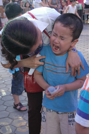 Trong lúc làm thủ tục cho các cháu tiếp theo, nhiều phụ huynh vì con khóc quá phải theo đến điểm các cháu xếp hàng an ủi mãi. Một số cháu vẫn không ngừng khóc khi lên đến phòng thi, đòi mẹ, đòi về. Các giám thị vòng ngoài phải động viên bằng đủ mọi cách. Cháu nào không vào thi được ngay sẽ được cho thi ở lượt tiếp.