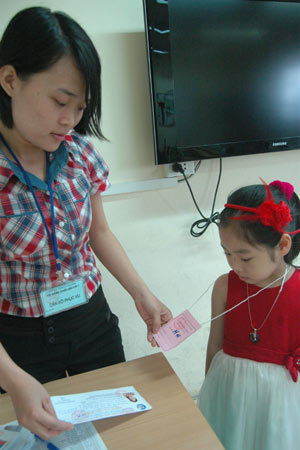 | Trước khi nhận phòng, tất cả các bé sẽ được đeo mã số riêng. Thay vì để các cô gọi tên, tuổi, các cháu sẽ vào phòng thi theo mã số trên để tránh hiện tượng có thể xảy là việc “châm trước” của một số thầy cô. |
