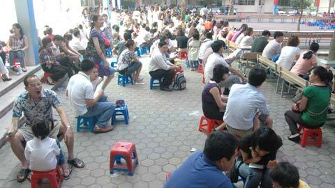 Trong sân trường, không khí càng trở nên nóng bỏng. Phụ huynh đứng ngồi nhấp nhô dưới sân trường, trên ghế đá, trong phòng chờ,…tất cả các vị trí không vị phạm đến khu vực tuyển sinh. Năm nay trường tuyển 400 chỉ tiêu nhưng có tới gần 1400 hồ sơ đăng kí nên trường phải chia các cháu kiểm tra thành 3 đợt.