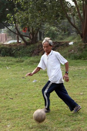 | Tuổi ngoài 60 nhưng tình yêu với trái bóng của lão nông Dương Khắc Kiểm vẫn luôn rực cháy. (Ảnh: Ngô Vinh) |