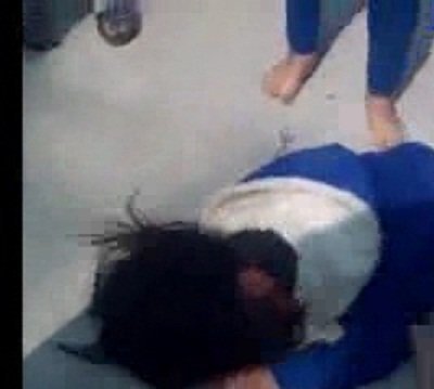| Cô gái mặc áo đen túm tóc rồi dùng chân đá vào mặt cô gái áo xanh |