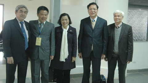 | GS Ngô Bảo Châu cùng GS Ngô Huy Cẩn và lãnh đạo Bộ GD-ĐT, Bộ Khoa học công nghệ tại lễ ra mắt Viện Nghiên cứu cao cấp về Toán, sáng 17/1. |