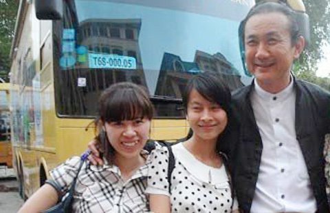 | Nói chuyện với sinh viên bên ngoài chiếc xe xuyên Á |