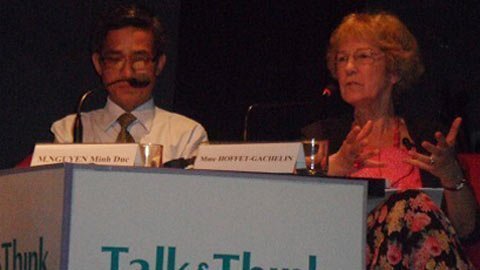 TS Marie-Eve Hoffet-Gachelin (chủ tịch hiệp hội Tâm lý Pháp – Việt) và ông Nguyễn Minh Đức (TS tâm bệnh học và phân tâm học) chia sẻ những kinh nghiệm trong phương pháp dạy con ở Việt Nam và Pháp. |