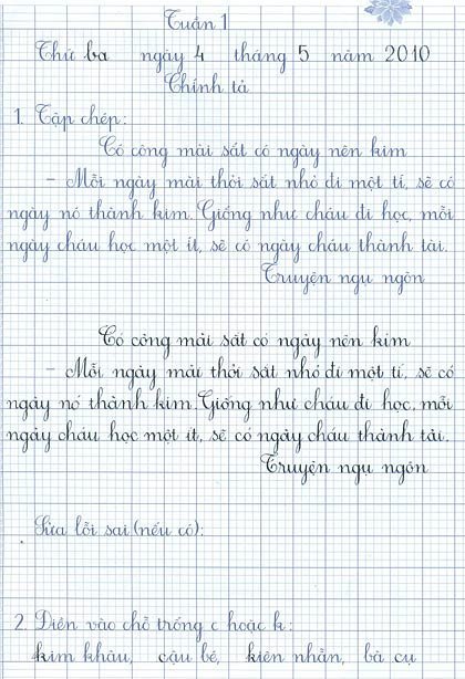 | Một mẫu vở chính tả có phần tập chép bằng chữ viết tay, ở dưới học sinh chép lại dễ dàng hơn và đẹp hơn theo mẫu. |