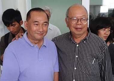 GS Nguyễn Đăng Hưng (bìa phải) và TS Nguyễn Chánh Khê (người "sáng chế" máy phát điện chạy bằng nước) |