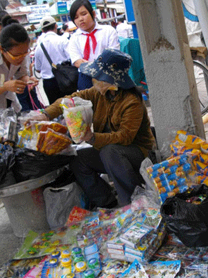 Chúng tôi thắc mắc vì sao kẹo bán cho trẻ em mà in toàn chữ Trung Quốc, liệu có an toàn không thì chị bán hàng nói chắc: Hàng lấy ngoài Chợ Lớn, đã chọn lọc kỹ rồi chứ ngoài chợ còn nhiều loại nhìn “ghê” hơn nữa. Khi chúng tôi hỏi làm sao biết bảo đảm chất lượng, không phải hàng độc hại thì chị này ấm ớ: “Mối hàng nói như thế và lâu nay học sinh ăn hoài mà có thấy bị gì đâu”...