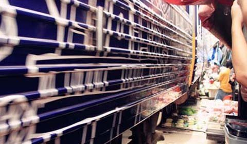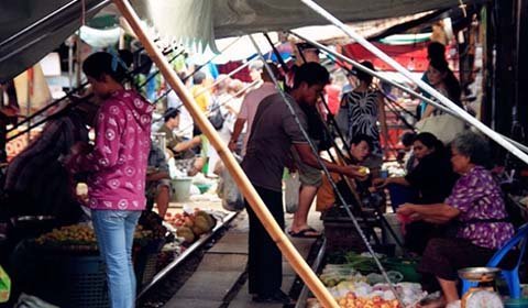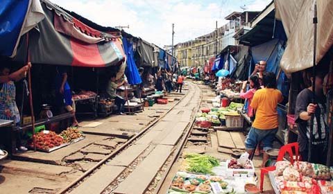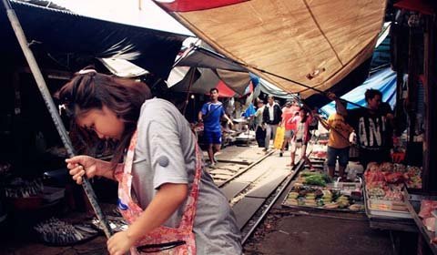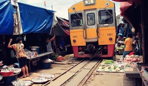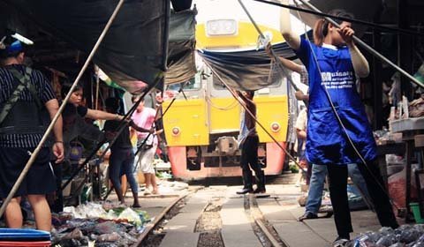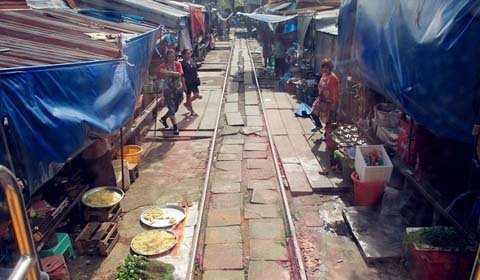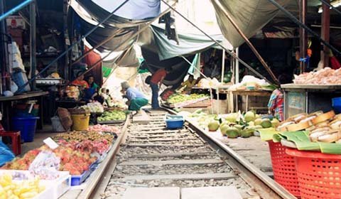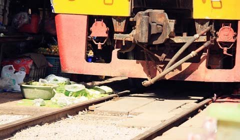 Cứ bốn lần một ngày, những tiểu thương ở khu chợ Maeklong (Bangkok, Thái Lan) lại thu dọn lều quán, đứng nép vào một bên khi nghe tiếng còi rồi lại đem hàng ra bày bán khi đoàn tàu đã đi khuất.