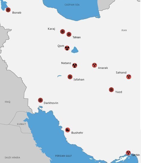 Các cơ sở hạt nhân của Iran, bao gồm nhà máy làm giàu uranium, trung tâm nghiên cứu, nhà máy hạt nhân và mỏ khai thác uranium. Ảnh: RIA |