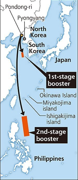 Mô phỏng lộ trình của tên lửa hai hành trình mà Triều Tiên dự định phóng để đưa vệ tinh lên không gian. |
