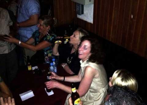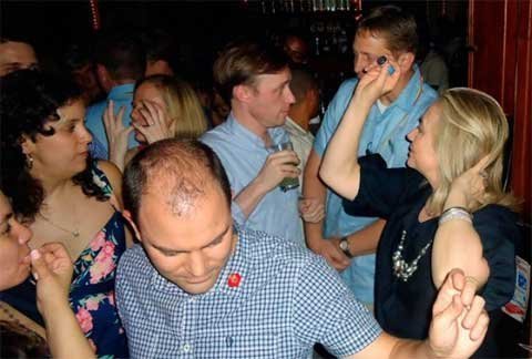 Rũ bỏ những vấn đề toàn cầu gai góc, Hillary đã cười và nhảy múa cũng như ngồi ở bàn nói chuyện vui và uống bia với mọi người.