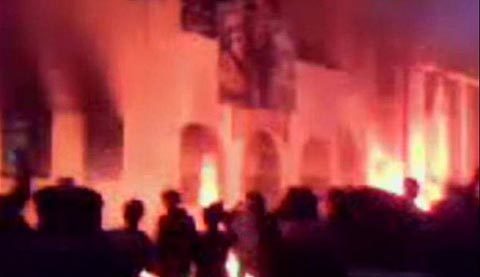 Hình ảnh trong một đoạn video nghiệp dư cho thấy một đồn cảnh sát bị đốt cháy ở Tobruk, Libya. (Ảnh: AP)