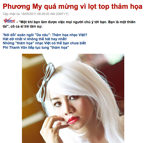 Cũng có những trường hợp kém may mắn hơn như anh chàng thần tượng online tự phong danh “Vua” hay “Trùm” gì đấy. Có vẻ những bước đi đầu tiên vào V-Pop quá khó so với tự làm trò trước ống kính nên đành nhận mình là thảm họa âm nhạc. Lần lượt xuất hiện trên báo chí với tên bài “Trăn trở về thảm họa”, “Sốc vì bị coi là thảm họa”...