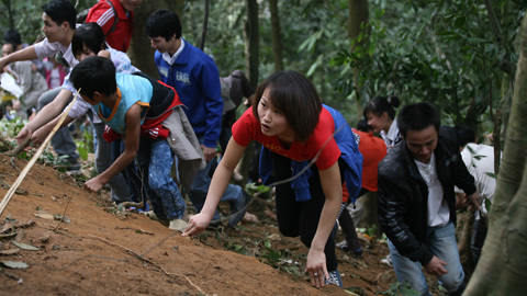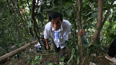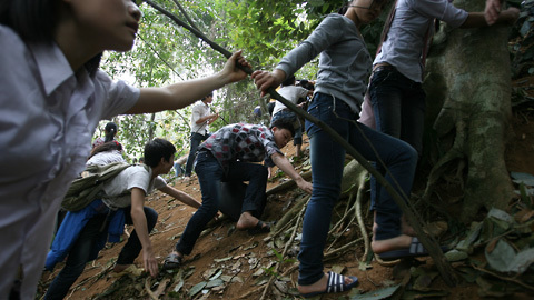 | Nhiều người không muốn đợi sẵn sàng bò, leo theo các sườn núi Nghĩa Lĩnh dốc dựng dứng rất nguy hiểm. |