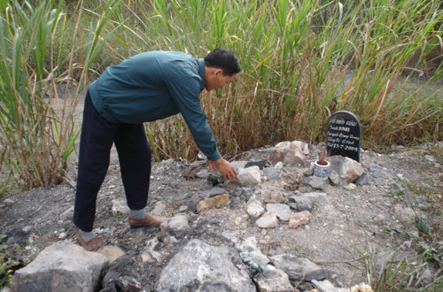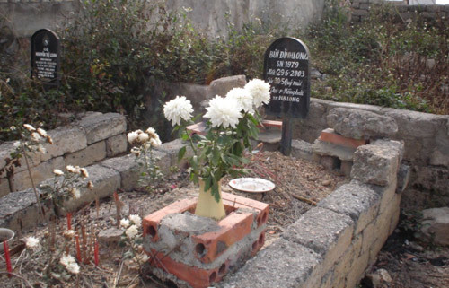 Anh chỉ biết rằng, đây là mộ của một người tù bị chết vì AIDS, người ta đưa về đây chôn. Từ khi chôn đến nay, đã 3 năm rồi mà không thấy người nhà đến nhận. Ngôi mộ không có bát hương, chỉ có những ngọn cỏ gầy héo đan nhau chằng chịt. Mấy chân hương cắm vung vãi cháy hết đã mốc khô tự thuở nào. Đó là những cọng hương của người nhà những ngôi mộ mới đắp bên cạnh cắm vào với hy vọng “ma cũ đừng bắt nạt ma mới”.
