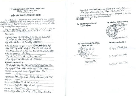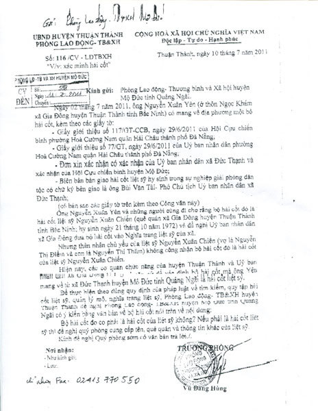 Theo người nhà liệt sỹ Chiến, sở dĩ phía Phòng LĐTB&XH huyện Mộ Đức không dám ký vào biên bản là vì trước đó, phía huyện Thuận Thành đã gửi văn bản tới huyện Mộ Đức để xác định lại bộ hài cốt này.
