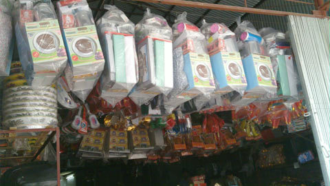 “Năm nay còn có cả… đồ chơi cho người lớn, em bé: trống, đàn ghi-ta, đồng hồ, dây chuyền, kính mát, có cả bộ đồ trang điểm như gương, lược, phấn son… Trần sao âm vậy con ạ!” – cụ Vui mau mắn.