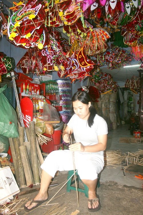 Chị là người trực tiếp bán hàng. Bên trong phía sau nhà, một xưởng chế tạo, lắp ráp các loại lồng đèn làm việc trong lặng lẽ. Vẻ quạnh hiu của một buổi chợ chiều phủ khắp xóm lồng đèn này từ lâu lắm và giờ đây chỉ còn một vài hộ còn cố níu kéo cái thưở vàng son xa xưa.