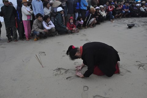 Còn anh Đặng Ngọc Tứ (xã Bình Sa, Thăng Bình) đang quỳ gối xuống bờ cát mòn mỏi chờ đợi tin cháu trai là Đặng Ngọc Thiện trong vô vọng.