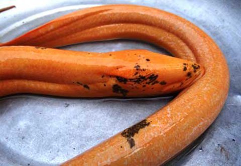 Điểm khác biệt duy nhất của con lươn này là có màu da vàng tươi óng ánh, khá kì lạ (Ảnh: Công an nhân dân)