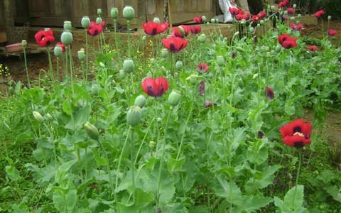| Cây thuốc phiện màu đỏ được trồng ngay bên cạnh nhà dân. |